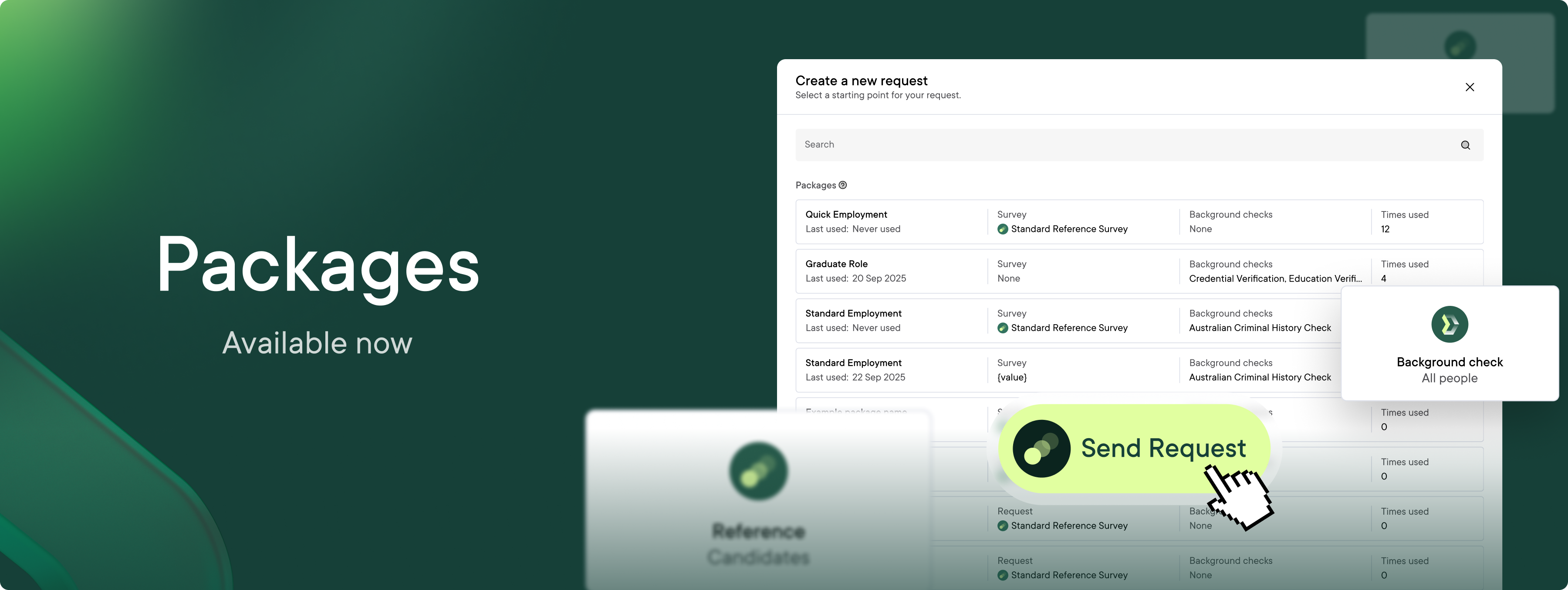 Packages are designed to help you standardise your screening requirements and eliminate the need for manual setup when sending repeat requests. By grouping all of Xref’s capabilities into a single, reusable configuration, you can ensure your organisation maintains a consistent and efficient hiring process. Access is available now within your organisation settings based on your existing product permissions, so you can start creating your own custom configurations immediately.